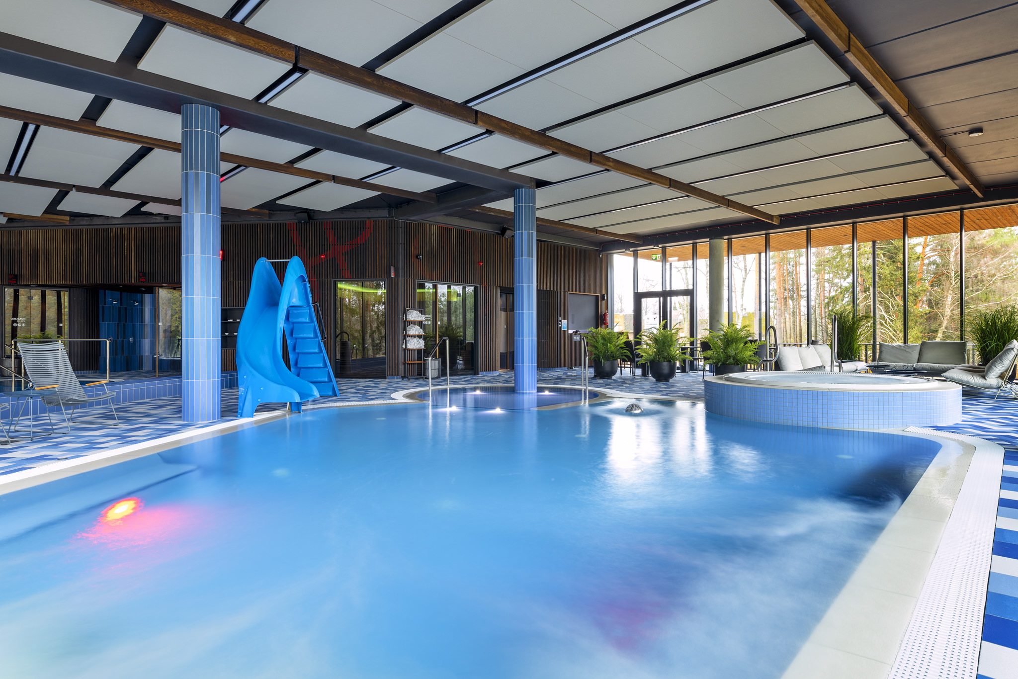 The temperature of the Tõrva Veemõnula children’s and pleasure pool is 33 °C. Here you can let the underwater massage jets of the pleasure pool relax your body, while the family’s smaller ones enjoy the water pleasures safely and the bigger ones enjoy themselves by going down the waterslide.