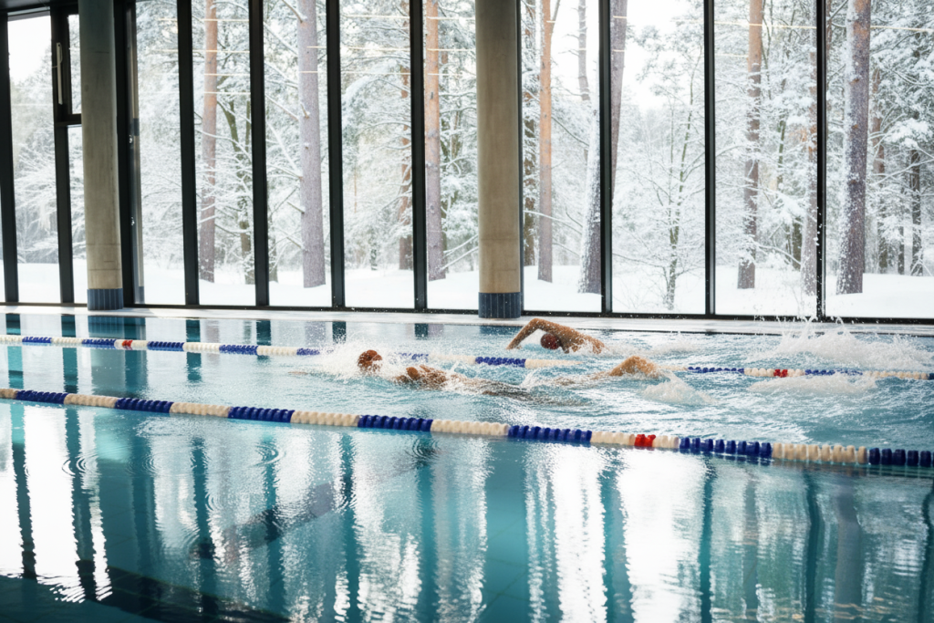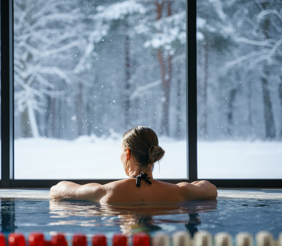 A large 25-meter swimming pool with three lanes, a spacious children’s and pleasure pool, jacuzzis, a relaxation area, and a sun terrace, all amidst scenic views.